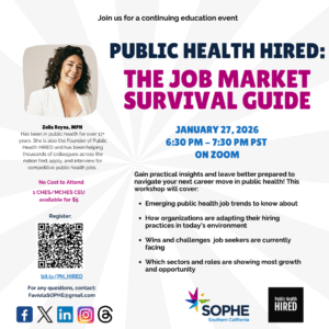 SoCal SOPHE is excited to have Zoila Reyna, founder of Public Health HIRED to provide us with a job market update and present The Job Market Survival Guide to our members. Zoila has been in Public Health for over 17 years and is currently helping Public Health professionals get hired and land their dream careers.