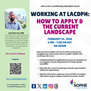 This month we will host “Working at LACDPH: How to Apply and the Current Landscape” on Tuesday, February 24, 2026 from 6-7:30pm. Our guest speaker is Daniel Rizik-Baer, MSW, and he will give us a better understanding of the application process, describe the current landscape and job opportunities within the department.