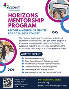 SoCal SOPHE’s Horizons Mentoring Program will match mentees with seasoned public health professionals to learn about the public health field, develop skills and receive guidance.